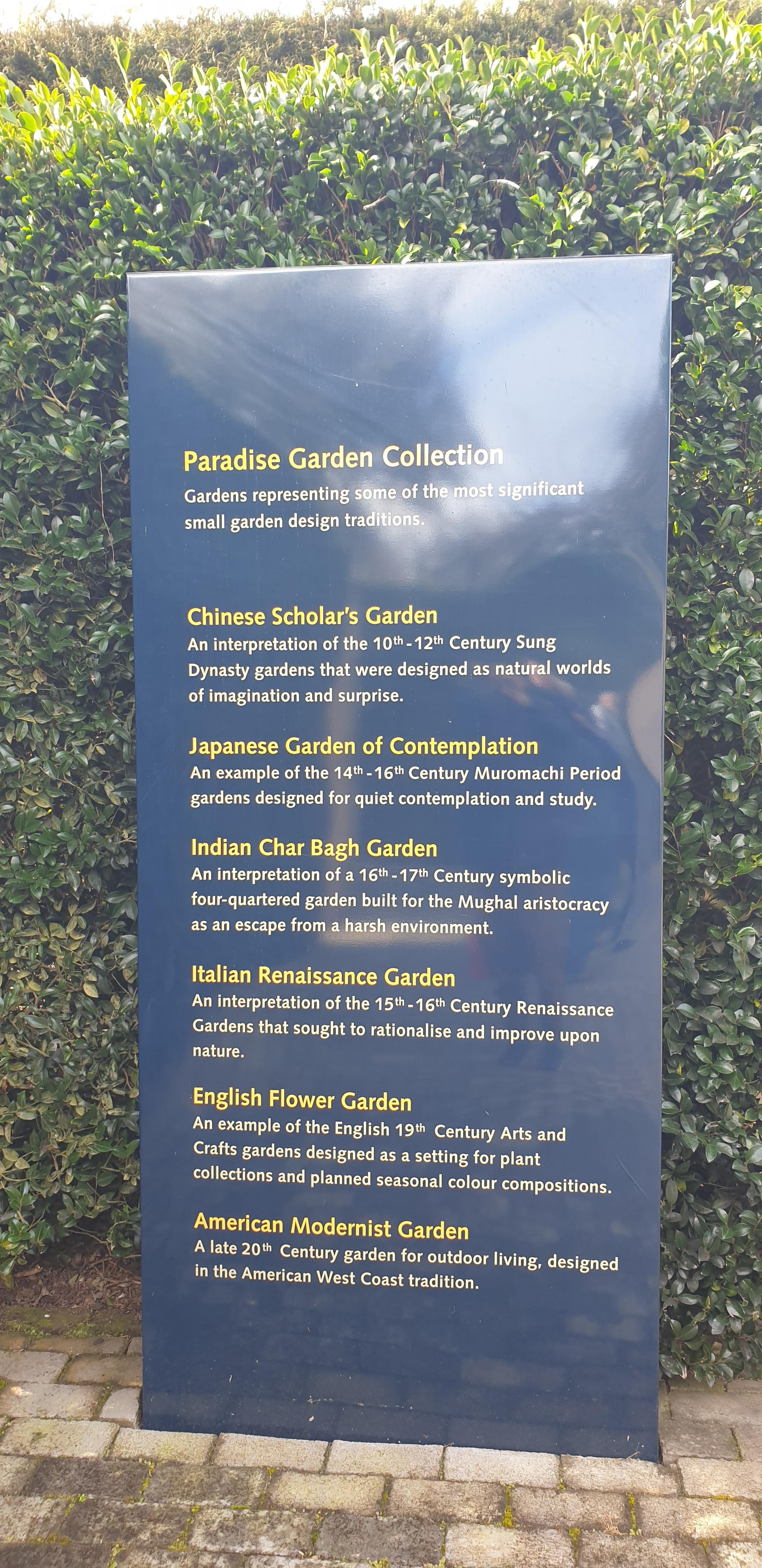 안내판을 보면 파라다이스 정원, 중국 정원, 일본 정원, 인도 정원, 이탈리안 정원, 잉글리쉬 정원, 아메리칸 모더니스트 정원으로 구성되어 있다.