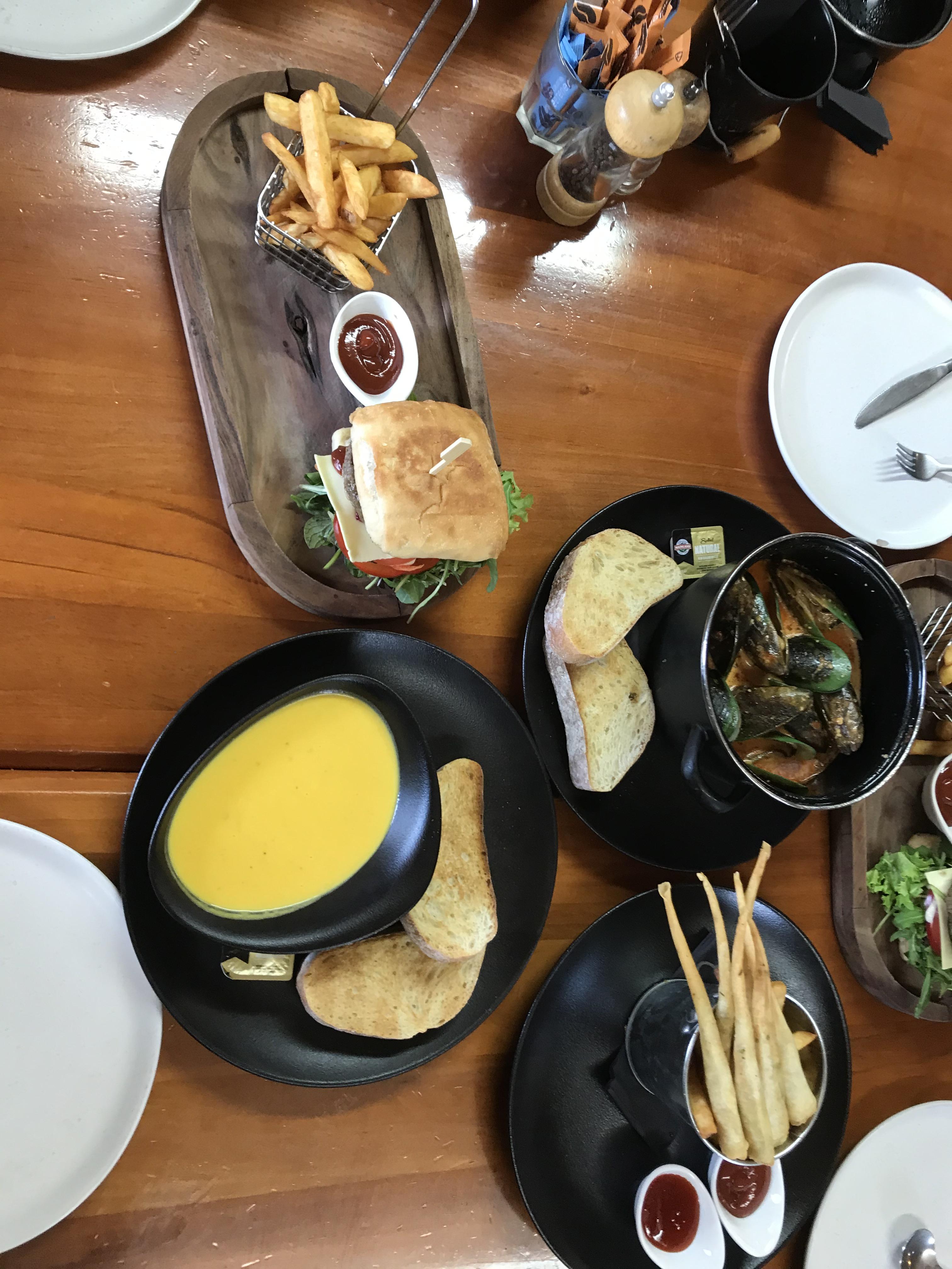 우리는 Beef Burger, Soup of the day, Steamed mussel, Warm garlic prawn salad 그리고 Prawn twisters를 주문했다.