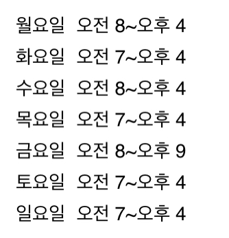 영업시간은 보통 오전 7~8시에서 오후 4시까지 하는데 금요일만 특별히 오후 9시까지 오픈한다고 한다.