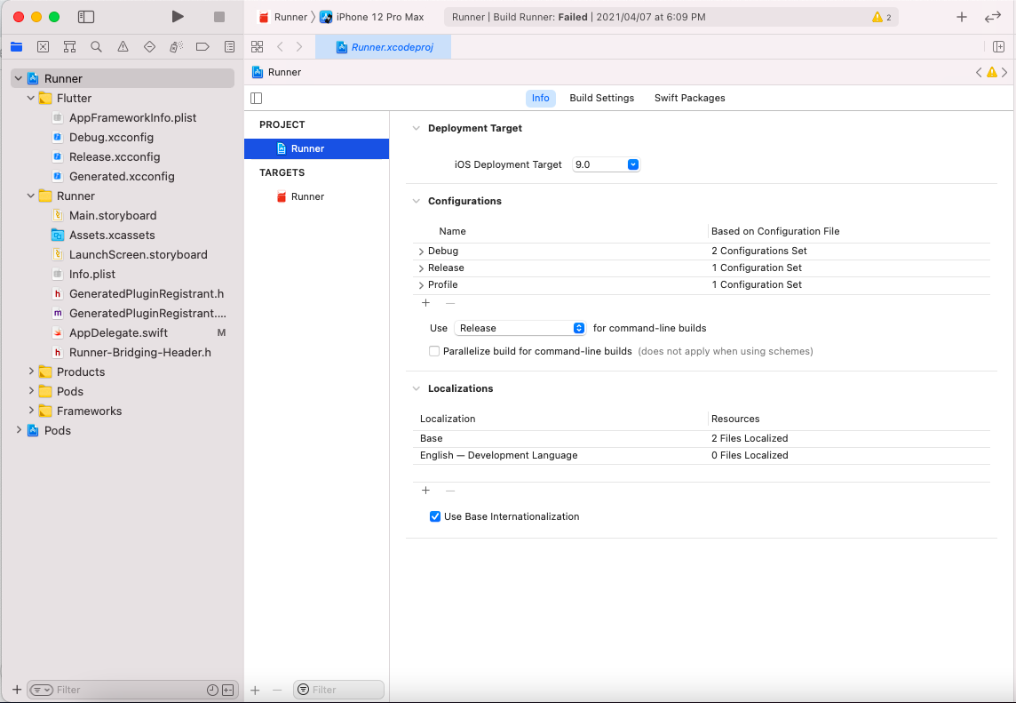 XCODE를 열고 프로젝트를 선택하면 Info 탭에서 Localizations 항목을 볼 수 있다.