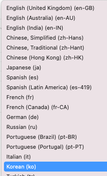 + 버튼을 누르면 나오는 목록에서 Korean 을 찾을 수 있다.