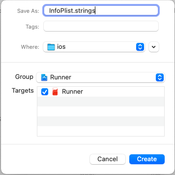 파일명은 InfoPlist.strings 라고 입력해야 한다.